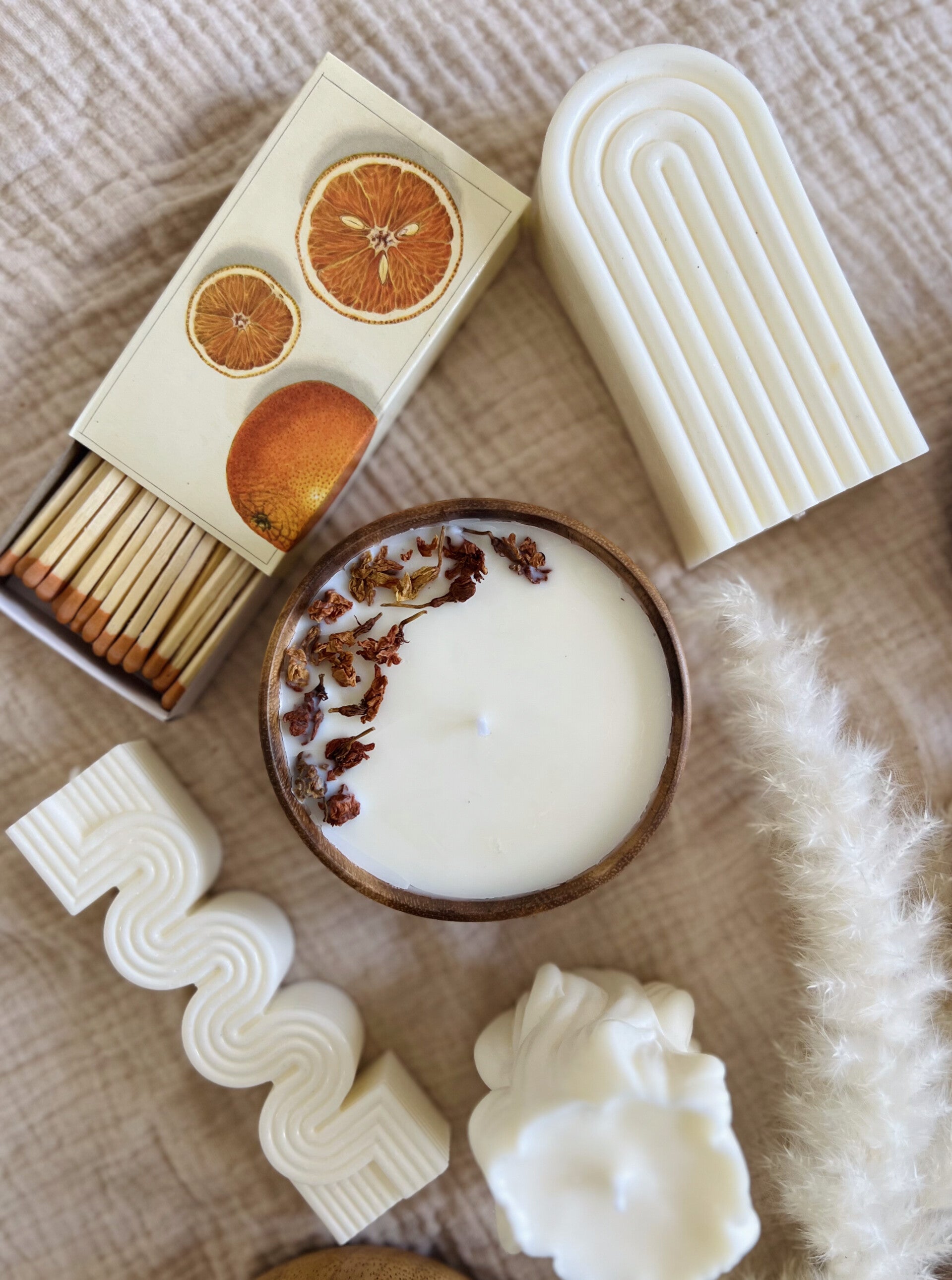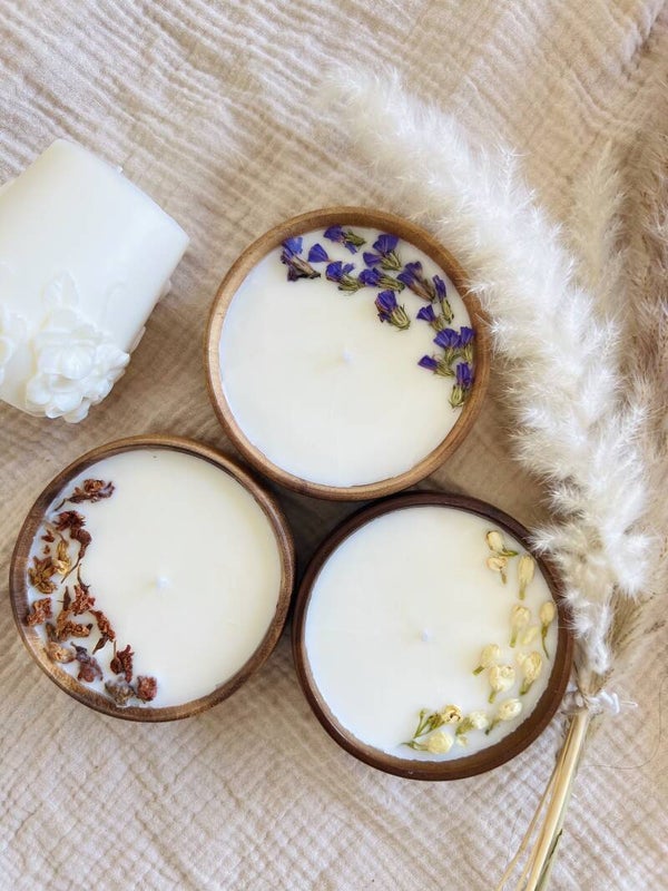 Indulge in a soothing ambiance with our handcrafted botanical candles, beautifully presented in natural wooden bowls. Each candle is topped with delicate dried flowers, adding an earthy and artistic touch to your space. Made with natural soy wax, these candles burn cleanly and provide a long-lasting glow. Perfect for relaxing moments or as a charming gift.