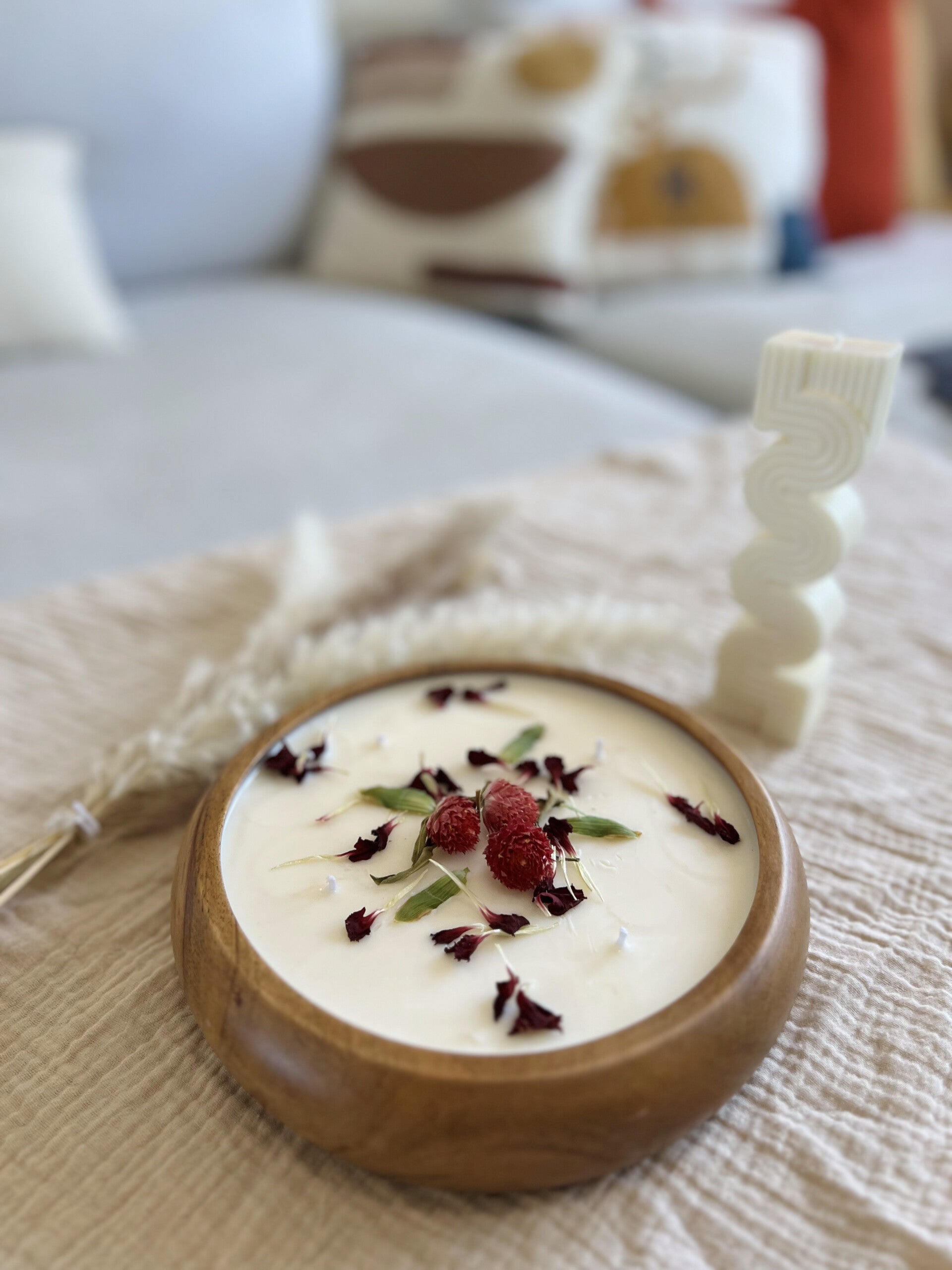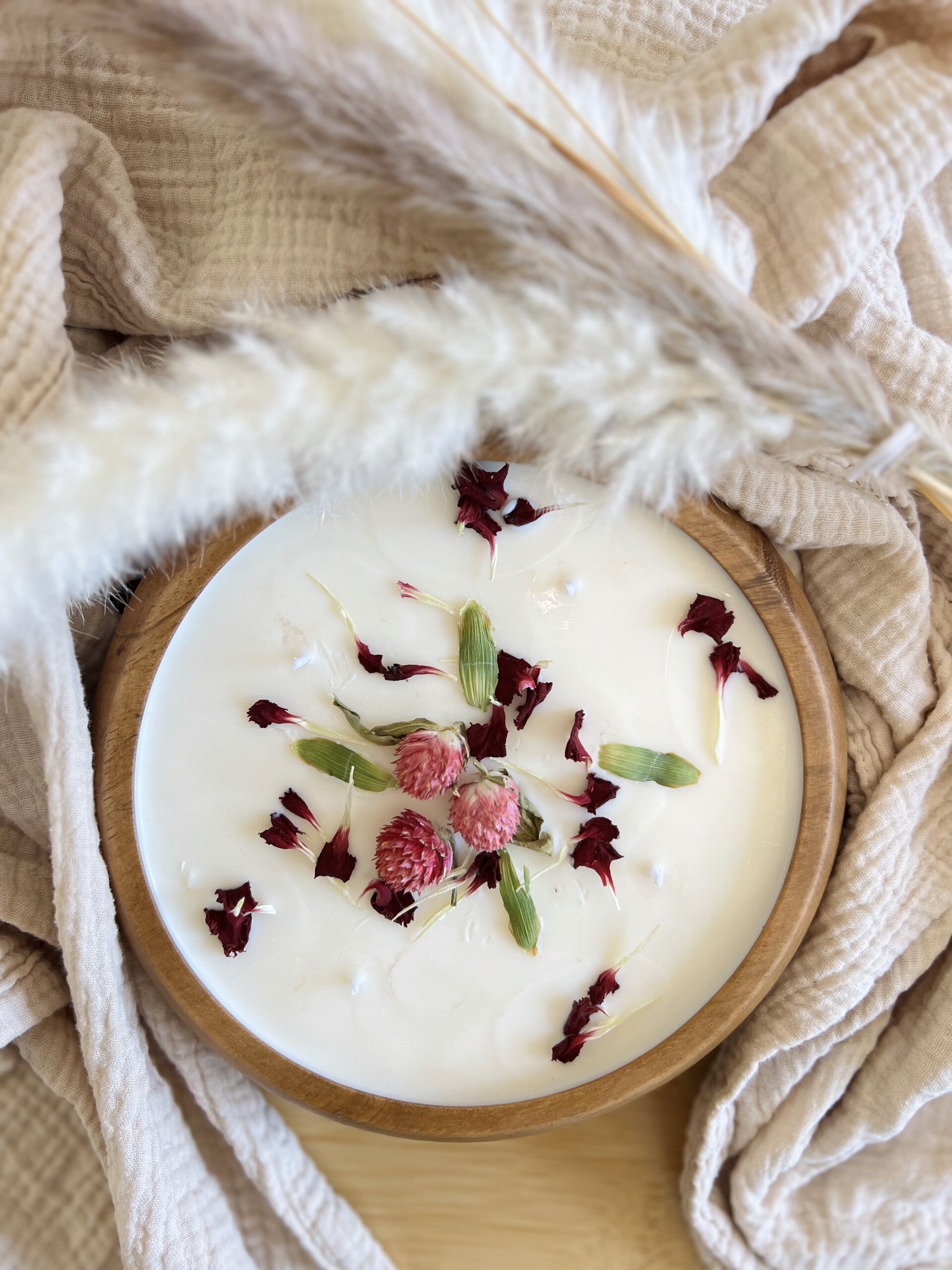 • Available with floral toppings: dried jasmine, cornflower, or safflower • Hand-poured into eco-friendly, reusable wooden bowl • Size 25 oz • Lightly scented to enhance your home’s atmosphere