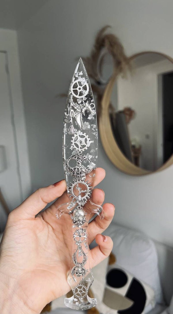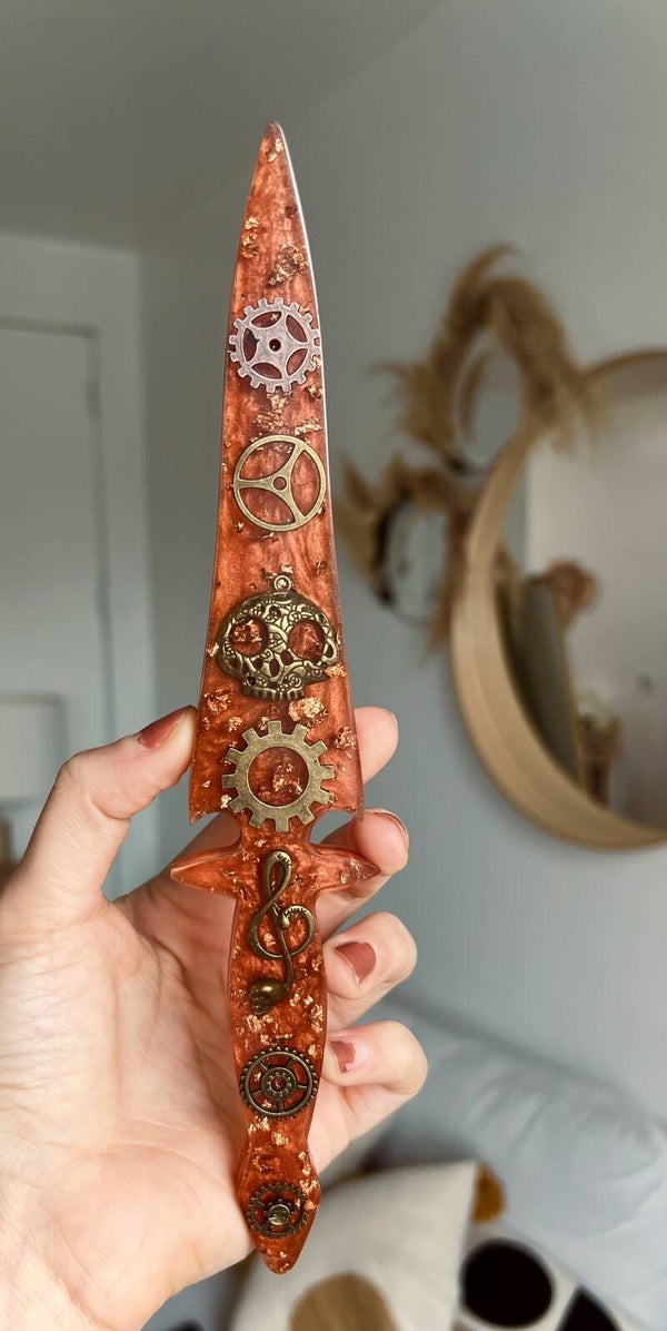 **Steampunk Petal Resin Dagger**, is a handmade, nature-inspired prop designed to captivate. Encased in shimmering resin, each dagger features preserved flowers and gold leaf, perfect for costume cosplay or as a unique décor piece. Whether you're searching for the ideal gift for her, a book lover’s treasure, or an accessory to complete your gothic collection, our daggers offer an enchanting touch of floral art. Elevate your cosplay, home, or gift-giving with these striking, one-of-a-kind creations.