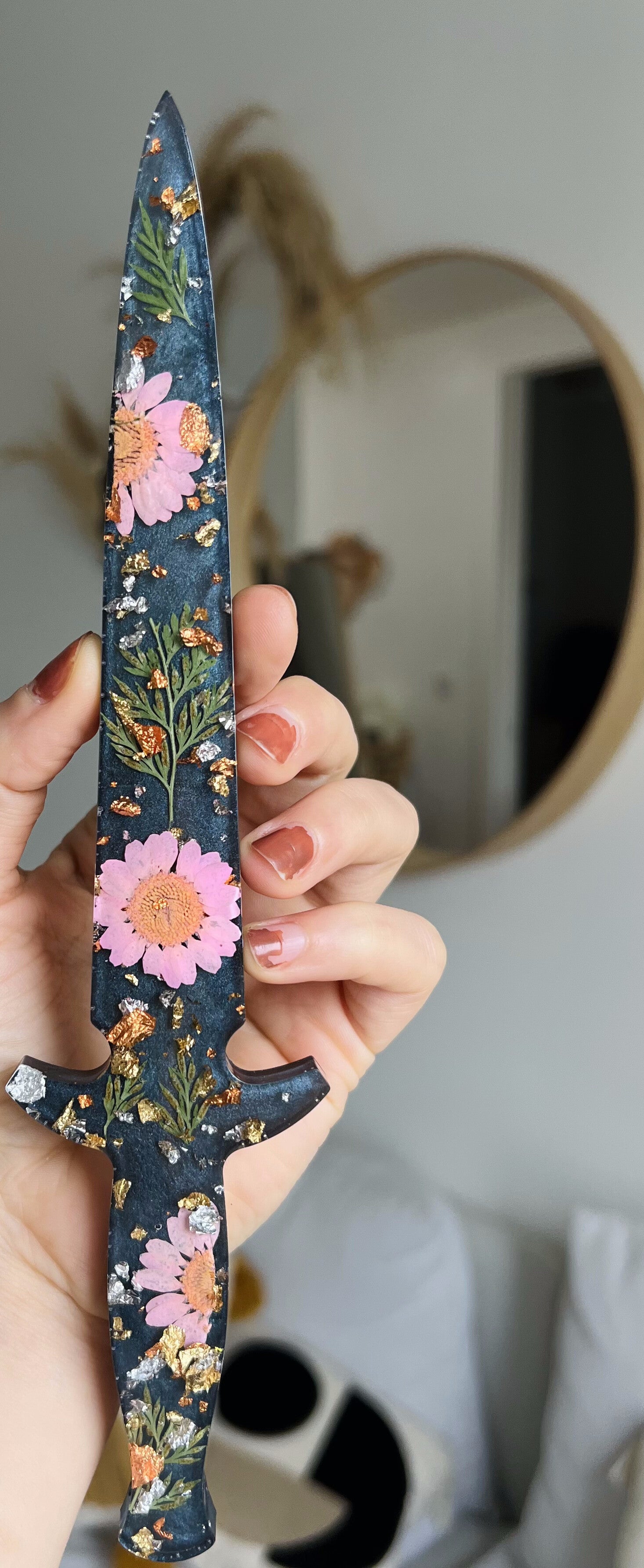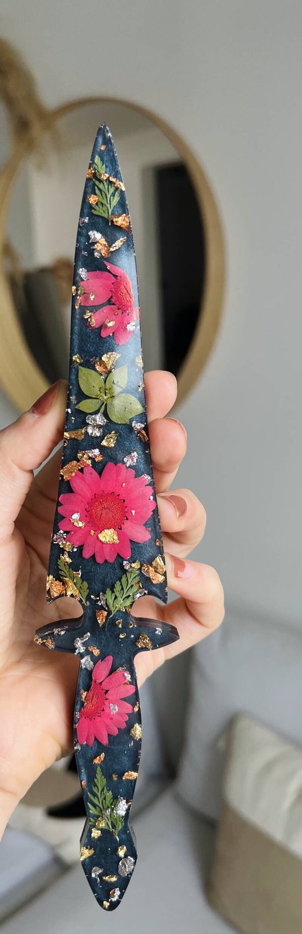 **Rose Petal Resin Dagger**, is a handmade, nature-inspired prop designed to captivate. Encased in shimmering resin, each dagger features preserved flowers and gold leaf, perfect for costume cosplay or as a unique décor piece. Whether you're searching for the ideal gift for her, a book lover’s treasure, or an accessory to complete your gothic collection, our daggers offer an enchanting touch of floral art. Elevate your cosplay, home, or gift-giving with these striking, one-of-a-kind creations.