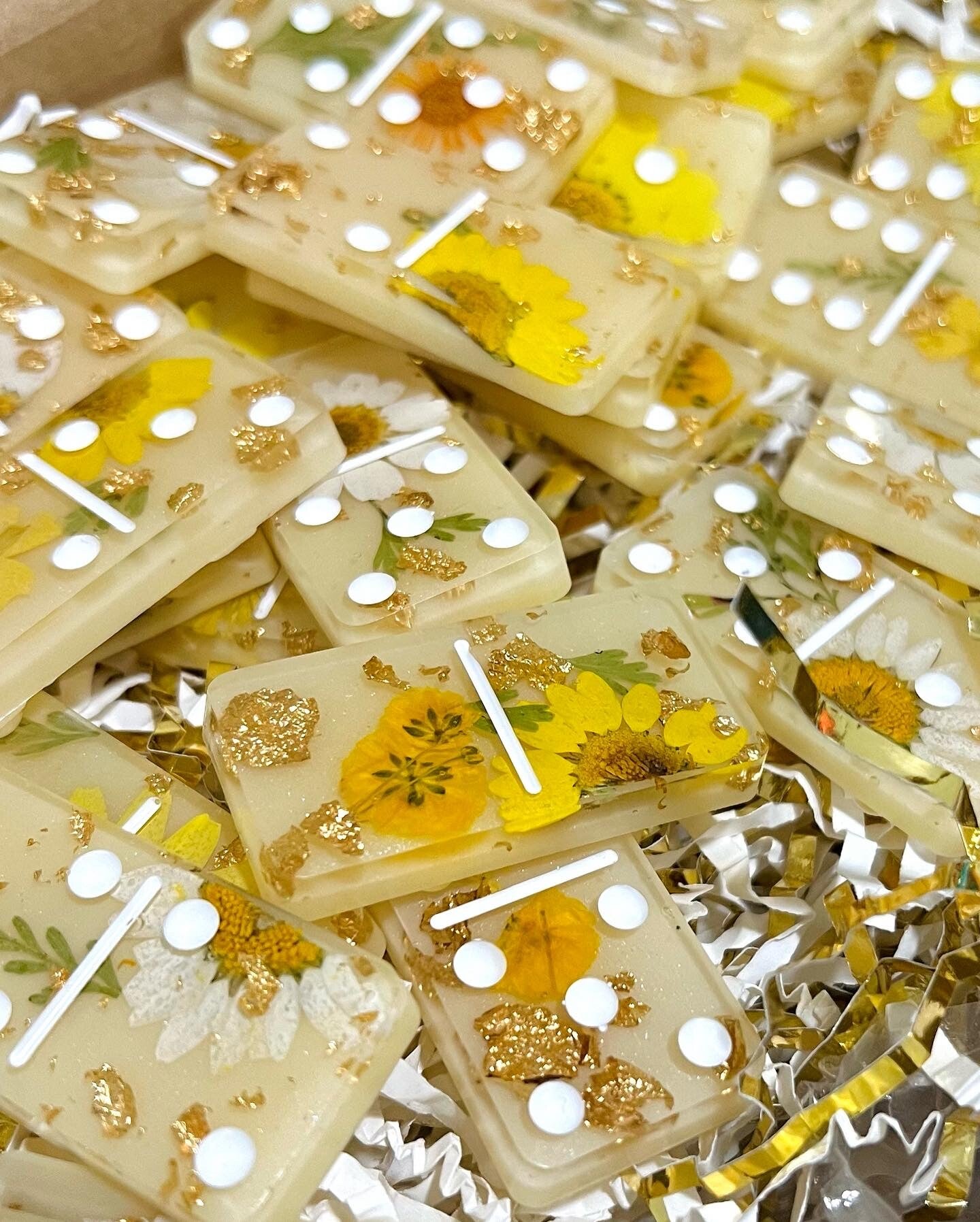a stunning fusion of nature and artistry, perfect for game lovers, home décor enthusiasts, or those seeking a unique gift. Each piece in this domino set is adorned with real flowers, delicate greenery, and shimmering gold flakes, making every game a charming experience. Whether for a special occasion, a gift for her, or an enchanting addition to your game collection, these dominoes offer beauty in every match. Celebrate the art of play with this one-of-a-kind, nature-inspired creation.
